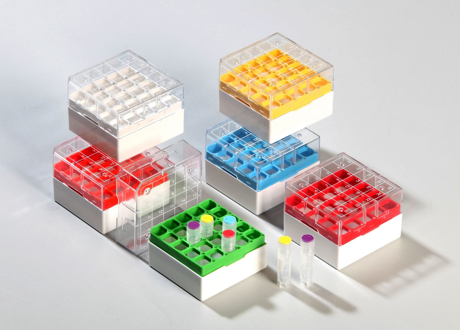 EPPi® cryoboxes made of polycarbonate (PC) are provided with opening slots in the base and lid, which are primarily used for storage in liquid nitrogen containers. EPPi® cryoboxes made of polypropylene (PP) do not have these openings and are mainly used in freezers and deep freezers. Both types of EPPi® cryo boxes are produced with a transparent lid as standard. The extensive EPPi® Box range also includes opaque boxes for the storage of light-sensitive samples.